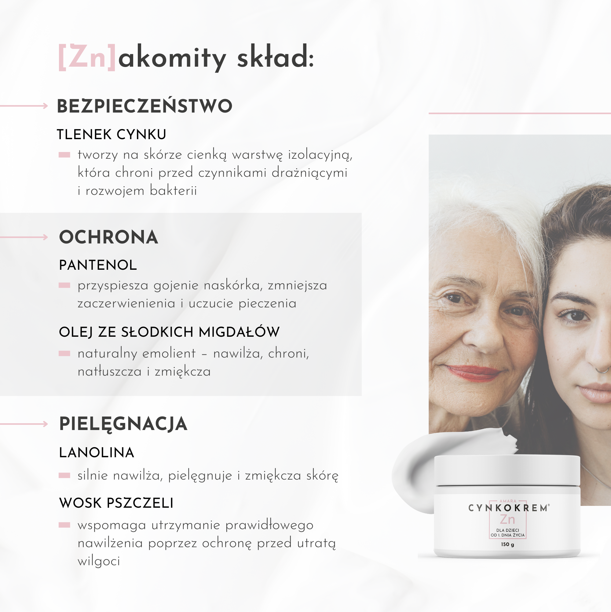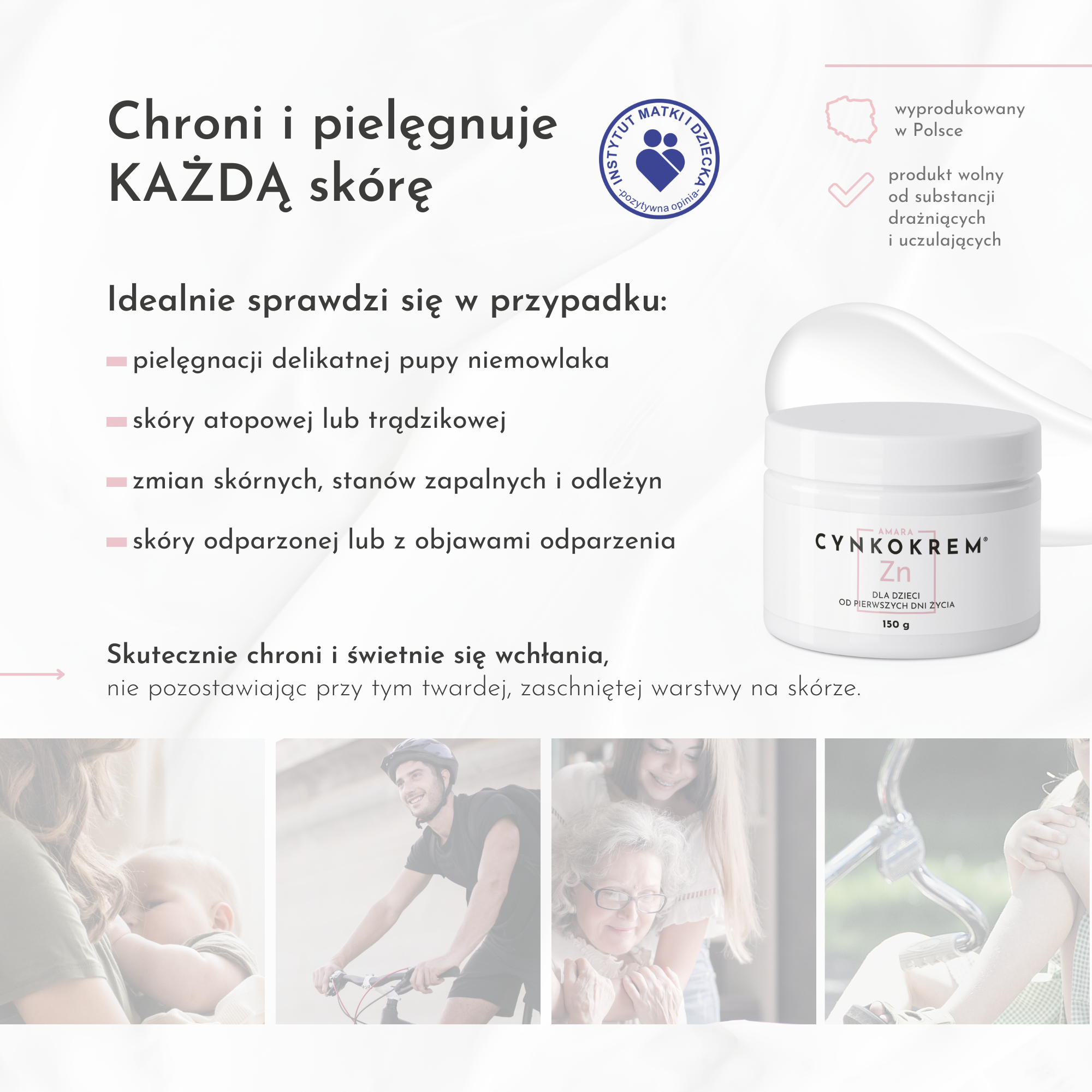 Cynkokrem to polska marka kosmetyków dla dzieci od pierwszego dnia życia oraz osób cierpiących na podrażnienia skóry o różnym podłożu. Cynkokrem szybko oraz skutecznie koi i łagodzi podrażnienia, nawilża i natłuszcza skórę. Nie zawiera substancji drażniących czy uczulających, a wykorzystane w produkcie naturalne składniki aktywne chronią skórę dziecka oraz zwalczają drobnoustroje.